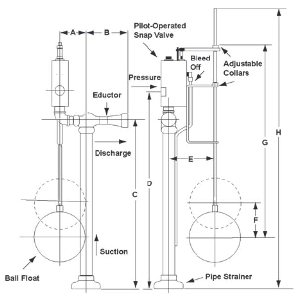 As the liquid in the sump (basin, tank, cellar, bilge, etc.) accumulates, it raises the ball float until the upward action of the float opens the snap-acting valve, admitting motive fluid into the pressure connection of the eductor.