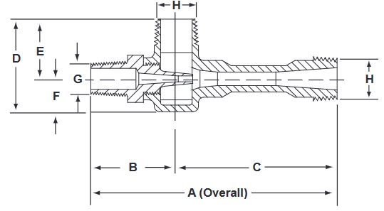 Furnished with a stainless steel funnel, the eductor can be made of any machinable material. Bronze units up to and including 3″ and cast iron units up to and including 4″ sizes are available from stock. Prices, delivery or a sectional outline drawing 67-XS-081-J will be furnished on request. Stainless steel funnels are stocked in 1- 1/4″, 1- 1/2″ and 2″ sizes.