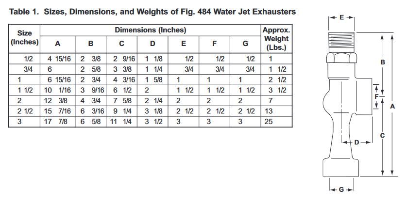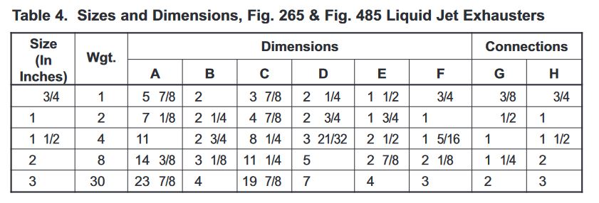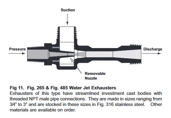 Fig. 265 & Fig. 485 Water Jet Exhausters are similar in design to the Fig. 464 Water Jet Exhauster and is made for liquid pumping and mixing operations and for handling some solids where requirements do not necessitate capacities greater than those obtained with sizes up to and including 3”.