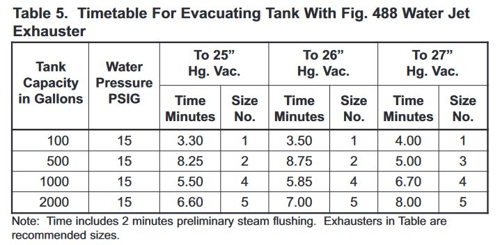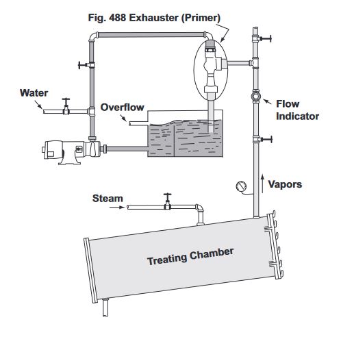 Fig. 4. Typical system for evacuating a closed tank. Steam is employed to flush air from the tank, and steam remaining in treating chamber is condensed by the exhauster. This technique reduces evacuation time. Table 1 gives the time in minutes needed to empty tanks of various capacities using different size exhausters. This method is recommended for tanks having a capacity of more than 120 gallons. Details on this and similar applications are available on request.