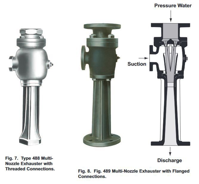 FIG. 488 AND FIG. 489 MULTI-NOZZLE, HIGH CAPACITY WATER JET EXHAUSTERS