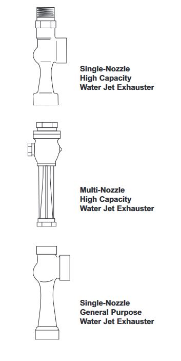 S&K manufactures single and multi-nozzle water jet exhausters. Each type is described on the following pages. Bulletins 4E and 5E-H describe exhausters that use steam or compressed air as the motive force.