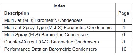 Barometric Condensers are of two basic types: (1) concurrent, or parallel flow, in which the vapor to be condensed enters at the top of the unit and flows in the same direction as the water, and (2) counter-current, or counter flow, in which the vapor enters near the bottom of the equipment and passes upward against the water flow. Injection water is delivered to the condenser in the form of jets, sprays, water curtains or a combination, depending upon service required.