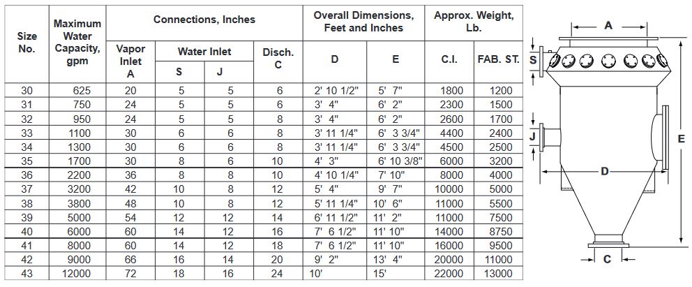 The Type 591 design is used for the four smallest sizes. It has the water inlet at the top and the vapor inlet at the side. This unit consists of a body (a closed cylindrical chamber), and water nozzle housing at the top water inlet; and jet type water nozzles.