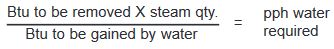 A simple heat balance is used to determine required water flow. Calculation is as shown in the following example. Given 50,000 pph steam at 300 psig and 600° F, reduce pressure* to 50 psig and temperature to 340° F (42 superheat). To solve, check steam tables to find enthalpy of both conditions. The enthalpy for 50,000 pph, 300 psig, 600° F is 1313.6 Btu per pound. The enthalpy for 50 psig, 340° F is 1202.0 Btu per pound. To find the heat that must be removed from the steam, subtract the enthalpy of steam at 50 psig and 340° F from the enthalpy of steam at 300 psig and 600° F, as 1313.6 – 1202.0 = 111.6 Btu to be removed per pound. Given available water at 50 psig (water pressure must equal steam pressure)** and 200° F, determine the enthalpy of the water from available tables as 168.0. To find the heat to be gained by the water, subtract the enthalpy of the water from the enthalpy of the desired steam condition, such as 1202.0 – 168.0 = 1034.0 Btu. Use the following to determine pph water required to reduce steam to desired temperature.