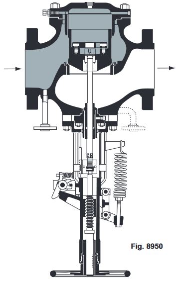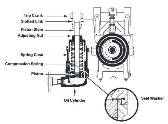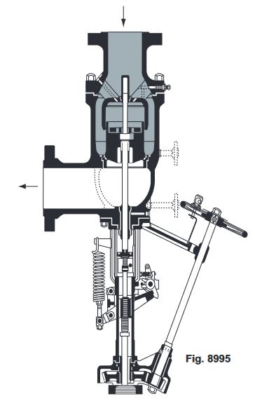 Trip Valve Function: The trip valve mechanism is activated by means of an air cylinder, oil cylinder, or solenoid. A manual lever can also be provided. When tripped, the latch lever is automatically disengaged from the latch hook. Working with the pressure of the internal steam or gas, a powerful compression spring in the yoke forces the entire spindle mechanism against the seat. A manual lever can be provided for operator override.